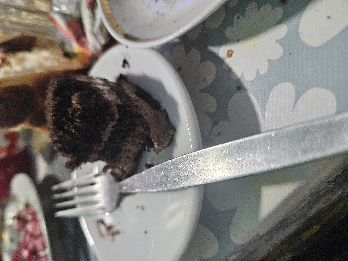This image depicts a close-up view of a dining table scene in an unspecified indoor location within Atiya, Bulgaria. In the foreground, a silver-colored metal fork rests on a white ceramic plate. To the right of the fork, on the same plate, is a partially consumed piece of dark chocolate cake, showing multiple layers of dark cake and dark frosting, topped with fine crumbs. Small chocolate crumbs are scattered on the white plate and also on the light blue tablecloth, which features a repeating white floral pattern. In the blurred background, other dining elements are visible: a white plate containing reddish-pink food is present on the left, and a white bowl with a gold rim is partially visible on the right. Additional out-of-focus objects, likely food items or serving dishes, are discernible further back. No individuals are present in the frame.