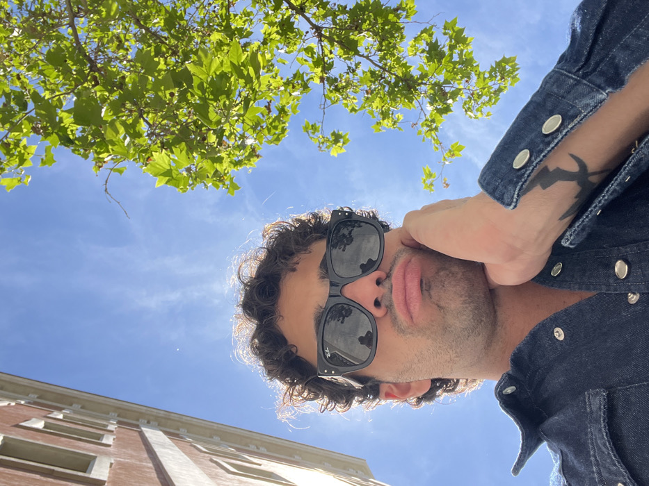 young man with curly brown hair wearing black sunglasses and a dark blue denim shirt, standing in front of a brick building and a tree