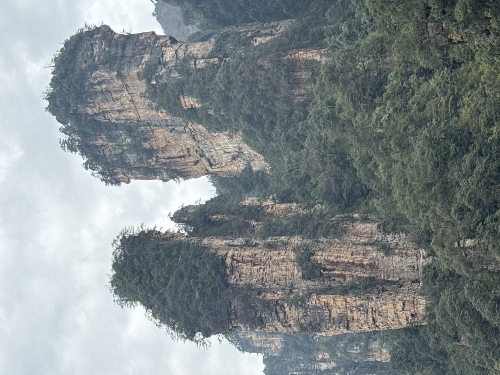 The image presents a natural landscape in Luoguta, China, dominated by multiple towering sandstone formations under an overcast sky. In the immediate foreground and midground, two prominent, vertically oriented karstic pillars are visible. The pillar on the left is slender and densely covered with green vegetation on its summit and upper ledges. The pillar on the right is broader, exhibiting prominent horizontal rock stratification and a flattened, tree-covered top. Both formations feature rugged, textured rock faces in shades of tan, brown, and grey, with significant portions obscured or softened by clinging dark green foliage. The lower and intermediate slopes surrounding these pillars are thickly forested. Further background elements consist of additional, less defined mountainous terrain also covered in dense vegetation. The sky is uniformly light grey and cloudy. No human figures, man-made structures, animals, or observable actions are present in the scene.