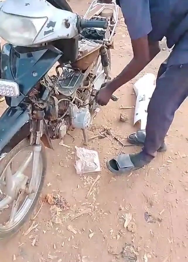 A young man is working on a disassembled motorcycle. He wears a blue shirt, dark pants, and black sandals with socks. He also has a dark beanie on his head. The motorcycle is missing its plastic fairings, exposing the engine. Parts are scattered on the ground around the bike. The ground appears to be dirt and gravel. Other motorcycles are parked in the background. The scene appears to be outdoors, possibly in a repair area or side of a road. He is working on the engine area of the motorcycle. The video ends with a view of the back of the motorcycle.