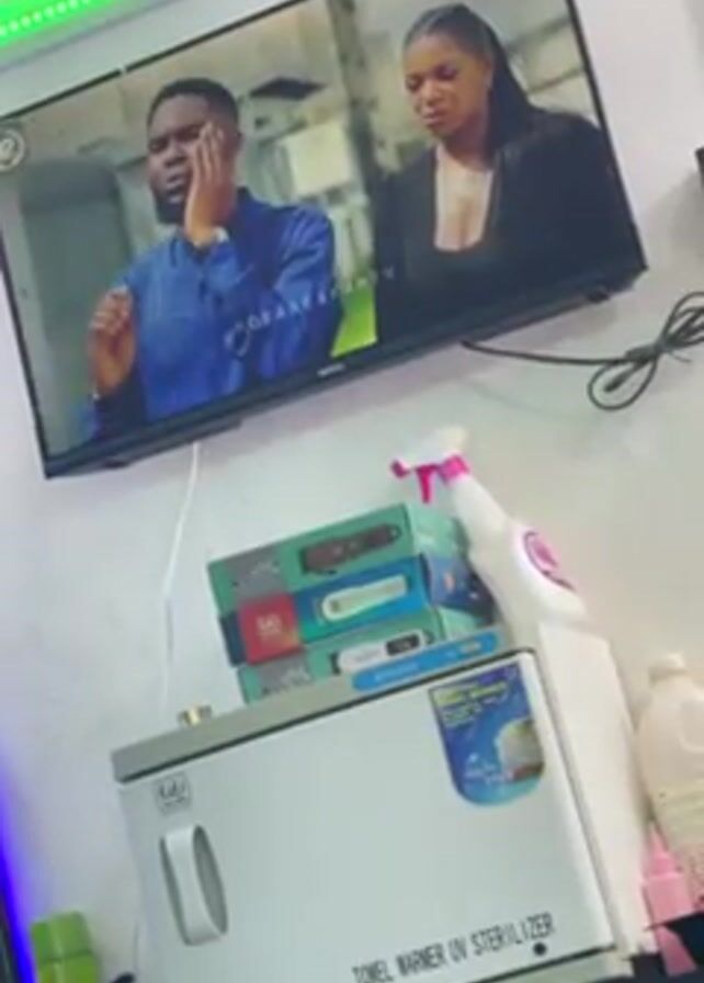 A television mounted on a white wall plays a video, showing two different scenes. Initially, the scene displays a man in a blue shirt holding his face, with a woman in a black blazer next to him. The scene then changes to two men; one in a gray shirt and cap, and the other in a purple shirt and cap. Below the television, there is a white cabinet with the label "TOWEL WARMER UV STERILIZER" on it. Stacked on top of the cabinet are several boxes, including one labeled "MITCHELLS." To the right of the boxes is a white spray bottle with pink accents and a bottle with pink liquid. To the left of the cabinet, a green spray bottle is visible. A green LED strip is mounted on the ceiling above the television.