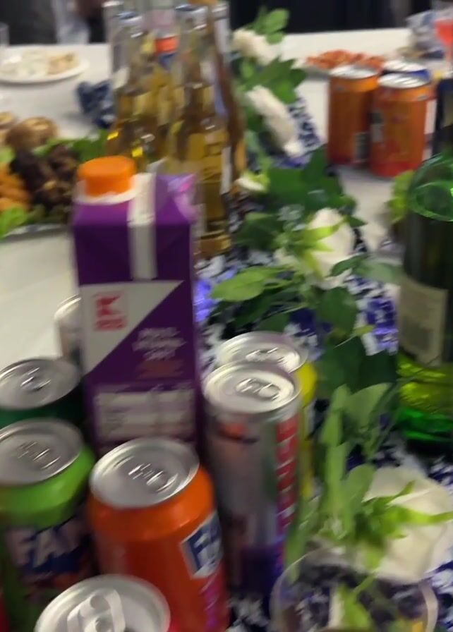 table laden with food and drinks, including plates of cheese, sausage, nuts, and fried foods. The beverages include soft drinks, juice, beer, and wine. The table is covered with a white tablecloth, and a blue runner decorated with white floral patterns stretches down the center. The scene is likely at a party or celebration, based on the variety and abundance of food and drinks. The camera pans across the table.