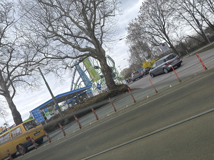 The image presents an outdoor roadside scene in Frankfurt, Germany, specifically in the vicinity of the Festplatz am Ratsweg. In the foreground, a dark grey paved road features two parallel tram tracks. A line of orange and white striped traffic bollards runs along the right edge of this road. On the left, a yellow Volkswagen T4 minivan is visible, partially obscured, with a German license plate. Adjacent to the minivan and extending into the midground is a JET gas station, identifiable by its blue canopy structure and a digital price display board. The board shows fuel prices in Euros: 2.399, 2.099, 2.159, and 2.479. Behind the gas station, a prominent green and blue rollercoaster structure rises against the sky, featuring a partially visible vertical banner with text including "GO." To the left of the gas station, two large deciduous trees with bare branches are visible. In the right midground, a multi-lane asphalt road accommodates vehicles. A silver minivan/SUV is depicted in motion, moving away from the viewer. Further down this road, additional vehicles are present, some appearing to be static or queuing. Several indistinct human figures are discernible in the distance near these vehicles. A patch of yellow flowering bush is visible further down the road on the right. The sky is overcast and light grey. Overhead power lines and various street furniture, including poles and signs, are also present.