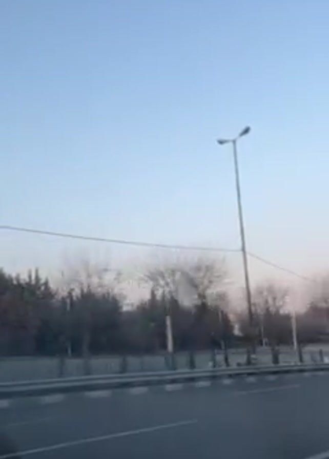 The video, shot from inside a moving vehicle, shows a road with a concrete barrier on one side. Beyond the barrier are trees, and in the distance, a plume of smoke is visible in the sky. Street lights line the road. The sky is clear and blue.