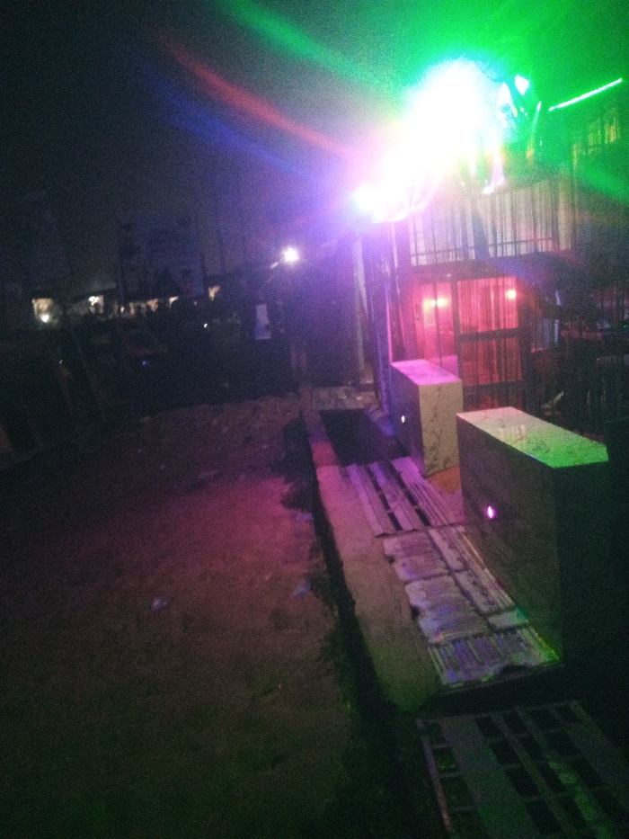 This nighttime scene captures a section of an urban environment in Onitsha, Nigeria, illuminated primarily by artificial light sources. A building on the right exhibits a façade with vertical elements, possibly window frames, and a lower section with red-tinged interiors, suggesting curtains or internal lighting. Prominent, bright, multi-colored light beams (green, purple, red, and blue) emanate from an unseen source above and to the right of this structure, casting significant illumination and lens flares across the upper half of the image. In the mid-ground, two light-colored, rectangular blocks, potentially benches or decorative planters, are positioned in front of the building. A concrete curb separates an unpaved, possibly dirt or gravel area on the left, which shows faint pinkish-red illumination, from a path on the right. This path contains two visible sections covered by corrugated metal sheets or wooden planks, likely bridging drainage channels or similar depressions. The background on the far left is dark, with vague outlines of other structures or distant activity discernible under minimal light. No individuals or specific actions are visible in the frame.