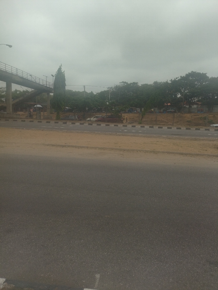 paved road in Aso, Nigeria (latitude: 9.046, longitude: 7.537). It is a gray, overcast day. There are several trees to the right of the road. A concrete pedestrian overpass extends from the left side of the road. The road is empty, with no vehicles or people visible. The overpass has a white, dashed line painted on it. There is a single streetlight on the overpass.