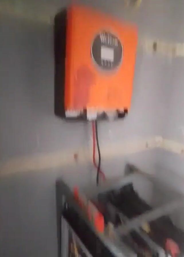 room with an orange "Welion" inverter mounted on the wall. Below it, a metal shelf unit holds a set of batteries. The room appears to be in a state of renovation or construction, as evidenced by the exposed wall structure and wiring. The camera moves slightly, showing different angles of the setup, including the batteries and the inverter. The lighting in the room is somewhat uneven.