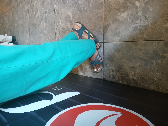 A person wearing bright turquoise pants and strapped sandals rests against a gray tiled wall. Their feet are slightly turned outward, revealing white toenail polish. The lower part of the image features a promotional graphic with white lettering above a red and white design. The person's legs are extended, creating a diagonal line across the frame.
