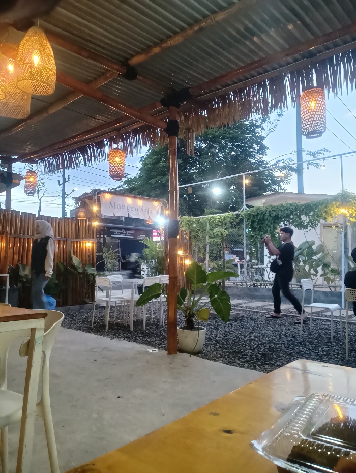 An outdoor dining establishment in Keudebayu, Indonesia, is depicted at dusk or early evening. The scene is illuminated by warm, artificial light from multiple woven rattan lanterns suspended from a corrugated metal roof with a decorative straw fringe. The roof structure is supported by dark wooden beams and bamboo poles. The ground transitions from a light concrete or paved area in the foreground to a dark gravel and pebble surface in the middle ground. In the left mid-ground, a person wearing a light-colored top, dark pants, and a head covering walks rightward past a bamboo-fenced area with potted plants. In the right mid-ground, another individual, dressed in a dark short-sleeved shirt and dark pants, walks rightward across the gravel, holding a camera or smartphone aimed towards the left, possibly taking a photograph or video. White plastic chairs and tables are arranged on the gravel surface. A prominent wooden table occupies the lower right foreground, bearing a clear plastic container with baked goods or pastries. In the background, a lit sign reads "Manggo Nala," with additional string lights and indistinct structures visible against a light blue sky with scattered trees. A chain-link fence is present on the right side of the background.