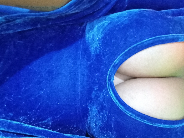 The image displays a close-up of an individual's upper torso, focusing on the chest area and prominent cleavage. The subject is wearing a deep V-neck garment crafted from blue velvet fabric, exhibiting a distinct texture with variations in light reflection and shadows that define its folds and contours. The neckline is edged with a matching trim. A portion of the garment, possibly a strap or tie, is visible along the right side of the frame. A small area of the person's skin, likely from the upper arm or shoulder, is visible on the left. The immediate environment is an indoor setting with ambient lighting, lacking further discernible details. The location is Nanyuki, Kenya.