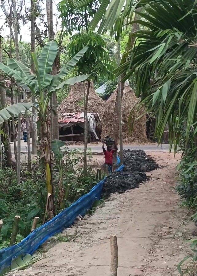 A video shows two figures walking along a dirt path in a rural area. In the first scene, one figure, dressed in red, carries something on their head as they walk along the path towards a collection of mud. The path is lined with trees and vegetation. In the background, there are haystacks and simple structures. The second scene shows two figures, the person in red and another individual, both carrying items on their heads, crossing a small bridge amid dense greenery. The vegetation includes banana trees and other tropical plants.