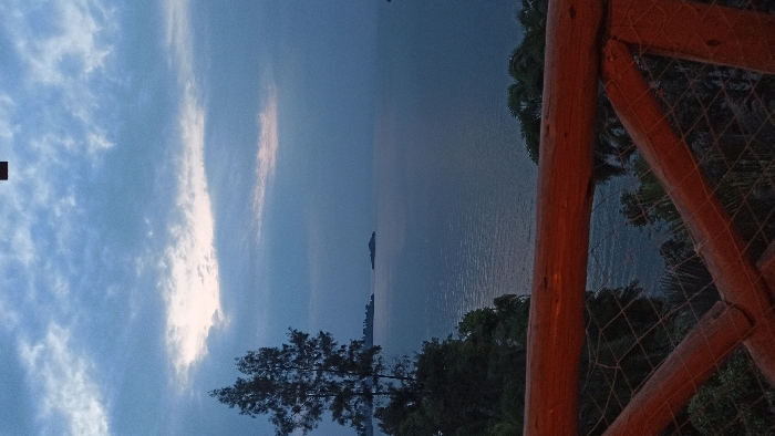 An outdoor scene displays a body of water, possibly a lake or sea, beneath a cloudy sky. The water reflects the sky's muted light. Trees and foliage line the shore, and a wooden railing structure is positioned on the right side of the frame. An island or land mass is visible in the distance on the water. The overall lighting suggests dusk or dawn.