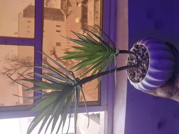This image presents an indoor view looking out a tinted window in Bauchi, Nigeria. A dark-skinned hand occupies the lower-left foreground, holding a white, fluted ceramic pot. The pot contains two artificial plants resembling agave or yucca, with green, spiky leaves, and the base is covered with a mixture of small brown and grey pebbles. The plants consist of one taller, more slender specimen and a shorter, fuller one. Behind the plant, a window frame with dark purple or indigo sashes is visible. The window pane is tinted an amber or orange color, through which an urban exterior scene is observed. The interior wall below the windowsill is a muted purple or indigo. The background, viewed through the tinted window, reveals elements of an urban environment under daylight conditions. Buildings with light-colored walls and dark, rectangular window openings are present. Corrugated metal roofs are visible on lower structures. A leafless deciduous tree with intricate branches stands against the bright sky. No other individuals or explicit actions beyond the hand holding the plant are discernable.