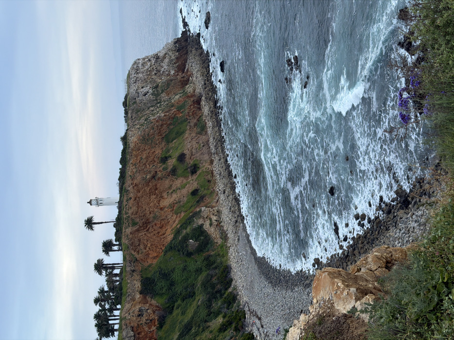 A cliffside with a lighthouse towers above the ocean. Red rock formations are dotted with greenery. Palm trees line the base of the cliff. Waves crash against the rocky shoreline, creating white foam. A rocky beach is visible beneath the cliffs. The sky is pale blue with light clouds. Purple flowers bloom along the edge of the cliff.