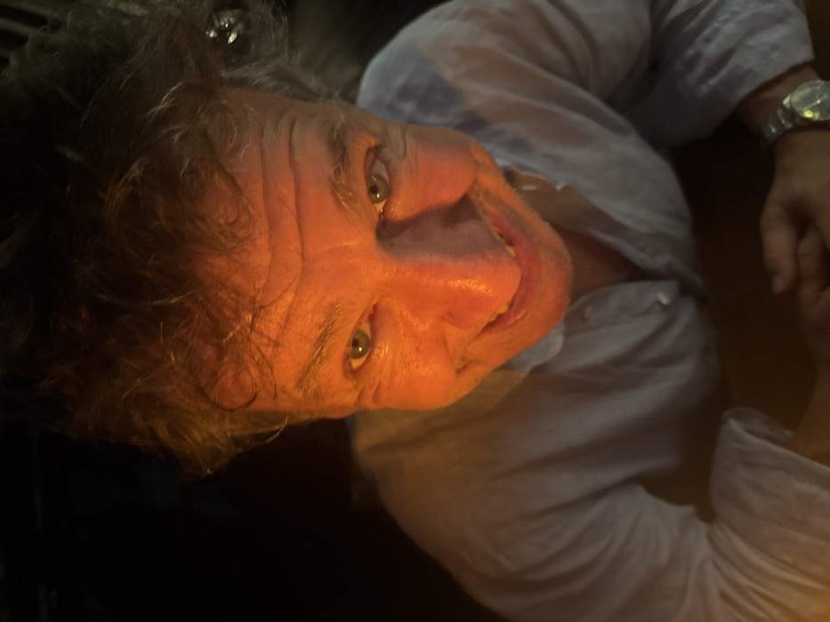 An upward-angled close-up shows an older man with fair skin and light-colored hair. His face is illuminated with a warm, orange glow. He is smiling slightly, revealing his teeth. He wears a light-colored, button-down shirt. A wristwatch is visible on his wrist. The background is dark, with a few indistinct shapes.