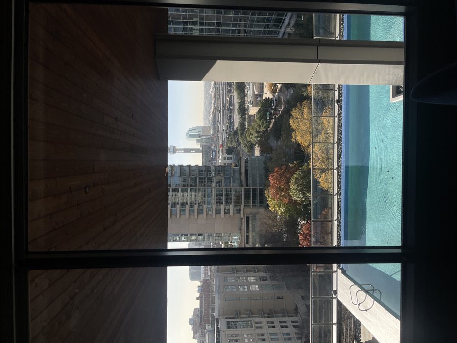 The image presents an urban high-angle view from an interior space in Dallas, United States, looking outwards through a dark-framed window