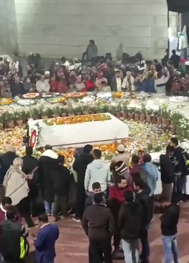 large crowd of people gathered around a rectangular structure covered with a white cloth and surrounded by flowers and greenery. Cameras on tripods are set up near the structure, suggesting the presence of media. The scene is lit by artificial lighting. The crowd consists of men, women, and children, some wearing traditional attire. Many individuals are holding phones, possibly taking photos or recording videos. There is a wall with a concrete-like finish in the background.