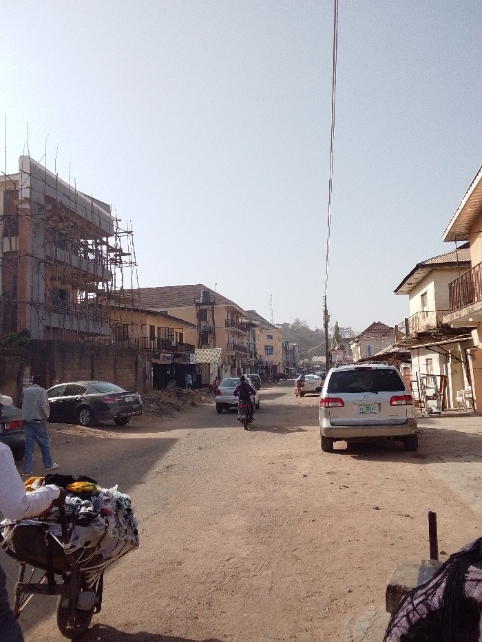 This image depicts a street scene in Jos, Nigeria, under clear, bright daylight