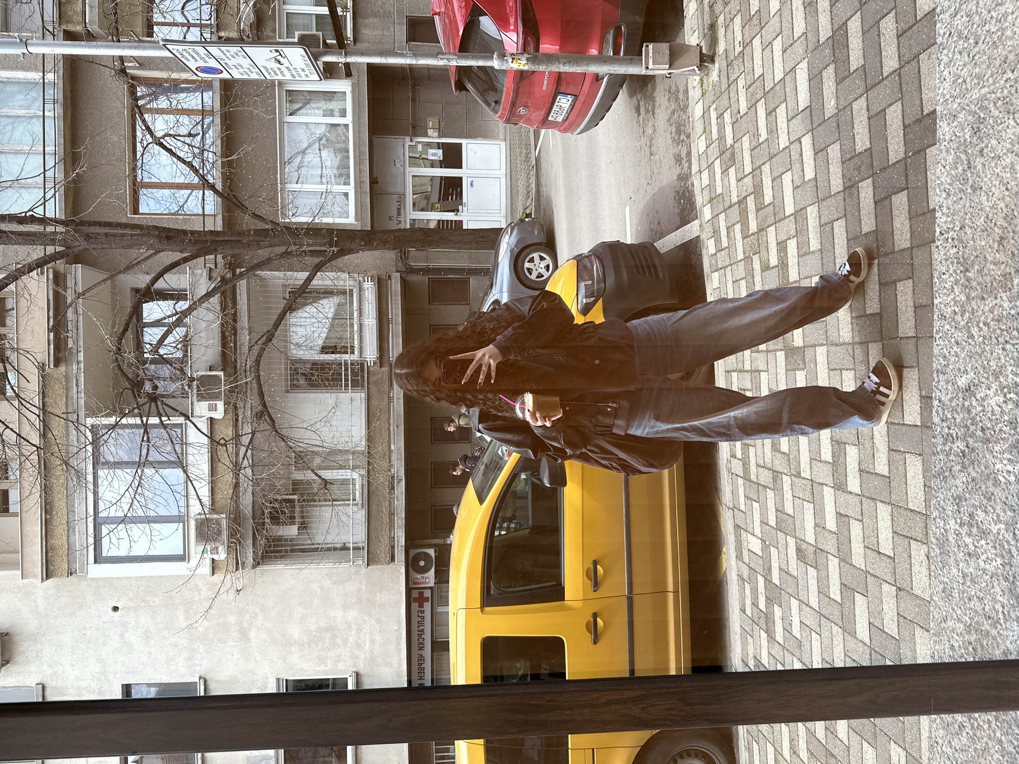 n individual standing on a brick sidewalk next to a yellow van. The person is holding a phone and a cup. Behind the van is a building with a sign written in Cyrillic next to a red cross. Further back, there are two parked cars, one red and one grey. The building in the background appears to be a residential or commercial building with multiple windows and air conditioning units. A bare tree is partially visible. The location is likely in Stara Zagora, Bulgaria, given the Cyrillic signage and car license plate visible.