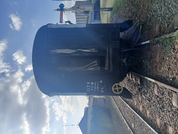 rear of a black train car on a track. The car has faded white lettering with the number 1129. A yellow wheel is visible near the bottom. The train tracks are surrounded by gravel. In the background, there is a train signal and buildings under a cloudy sky. The photo appears to be taken from a slightly low angle and is rotated.