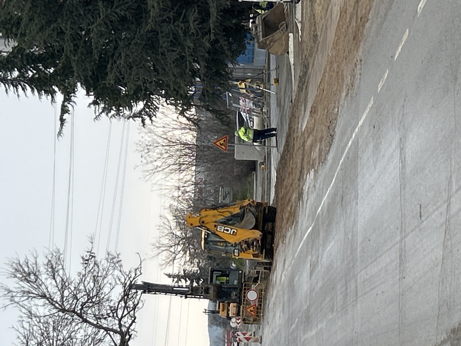 An outdoor scene depicts an active road construction site in Stara Zagora, Bulgaria, under an overcast sky