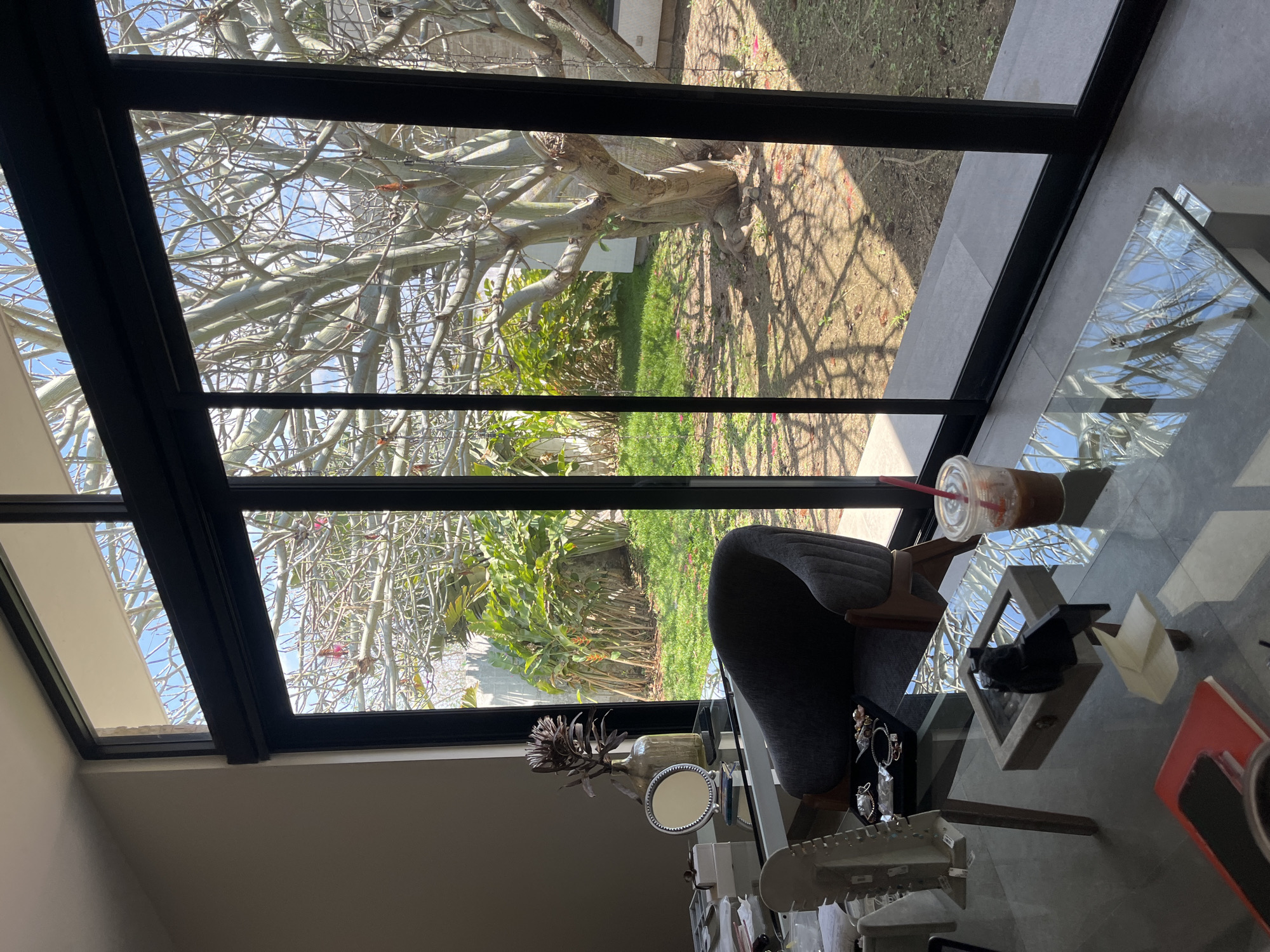 The scene depicts the interior of a room in Mérida, Mexico, looking out into a sunlit outdoor garden through large, black-framed sliding glass doors and a top transom window. Indoors, a glass-top desk or vanity is positioned to the left. It holds a round vanity mirror with a silver beaded frame and a vase containing dark, dried foliage. Various personal items are scattered on the desk, including a white jewelry stand, a black tray displaying rings and bracelets, and other miscellaneous objects. A dark gray upholstered chair with wooden elements is partially visible, positioned at the desk. In the lower right foreground, a smaller rectangular glass-top coffee table reflects the blue sky and the outdoor tree. On this table rests an iced coffee in a clear plastic cup with a red straw, a small wooden box with a glass lid, a black decorative object, a folded piece of light-colored paper, a red notebook, and a black smartphone. Outside, a large, mature tree with thick, light-colored, leafless branches dominates the view, exhibiting scattered small pink blossoms on some branches. The ground beneath the tree is predominantly exposed soil with patches of green grass and scattered pink petals or debris, indicating strong sunlight which casts distinct shadows. To the left of the prominent tree, a dense cluster of lush green tropical foliage is visible, with hints of orange-hued flowers. A light-colored concrete wall borders the garden in the background. The sky is clear and blue with minimal white cloud cover. No individuals are present in the scene.