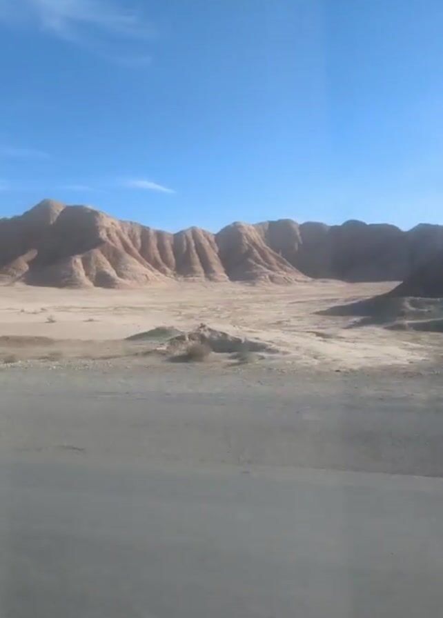 landscape with desert mountains in the background, viewed from a moving vehicle on a paved road. The sky is bright blue with a few wispy clouds. The mountains are a light brown color, and the terrain between the road and the mountains is a flat, sandy expanse with scattered low-lying vegetation. As the vehicle moves, a small, sparsely leaved tree appears in the frame on the right side of the desert landscape. The road is gray and shows some signs of wear. The lighting is bright and sunny.