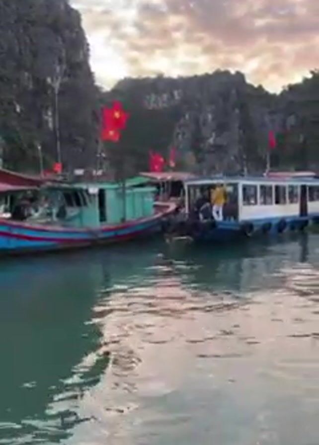 scenic view of a harbor or bay with boats docked against a backdrop of steep, rocky islands under a colorful sky. The water is relatively calm, reflecting the colors of the sky. In the foreground, there are two main boats: one painted in teal and red with Vietnamese flags and the other is a white and blue tour boat. People are seen boarding the white and blue boat. The Vietnamese flags are on both boats. The sky features a mix of light blue and soft pink and orange hues, indicating either sunrise or sunset. The overall setting is calm and picturesque.