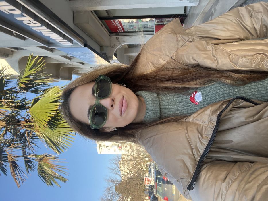 A woman is captured in a close-up selfie on an urban street in Bar, Montenegro, under a clear blue sky. She has long, light brown hair and is wearing translucent green rectangular sunglasses, reflecting the sunny environment. Her lips are slightly parted in a faint smile, and she has small silver stud earrings. She is dressed in a light green ribbed turtleneck sweater, featuring a small red and white embroidered mushroom design on the upper chest, beneath a shiny, light brown puffer jacket with a visible black zipper. In the background to her left, a large palm tree with vibrant green fronds stands against the blue sky, with a multi-story white building partially visible behind it. Further left and down, a street is discernible with parked cars, one of which, a dark grey Volkswagen Golf, clearly displays a Montenegrin license plate "BR ACE 508," confirming the city of Bar. To her right, a light-colored commercial building with arched architectural details is present. A prominent blue sign on this building reads "mobilTel" with smaller white text below, indicating a mobile service establishment. A shop window with a red border and various items on display is visible at street level. The scene is brightly lit by daylight.