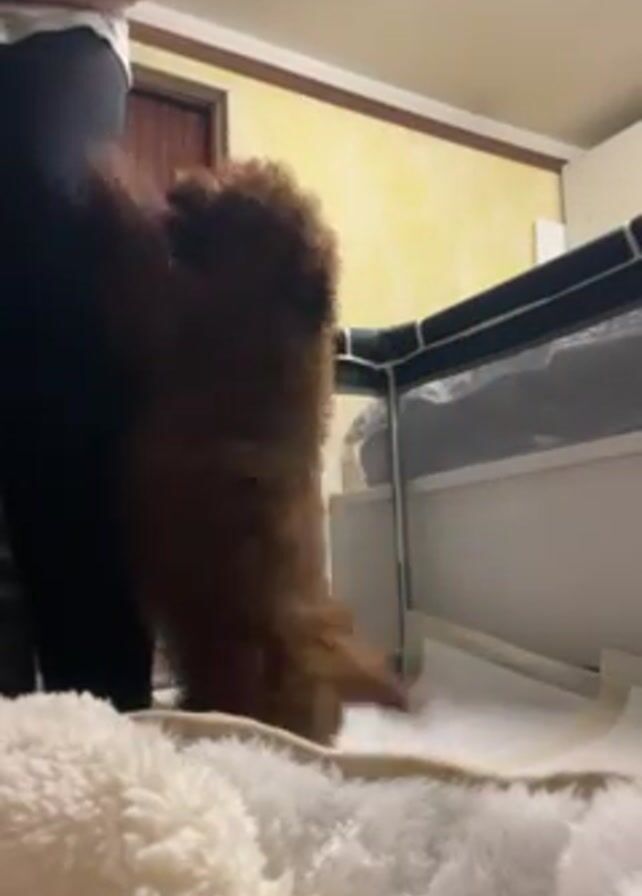 A person is standing beside a small, fenced-in pet playpen with a fluffy, light-colored blanket inside. A small, brown, fluffy dog is standing on its hind legs inside the playpen, reaching up to the person. The person is interacting with the dog, touching its head and back. The room appears to be an indoor space with a yellow wall visible in the background. There is a closed wooden door in the background to the left.