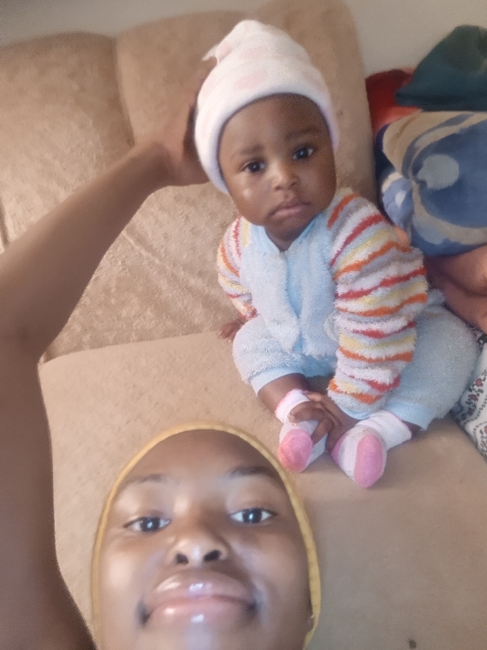The image depicts two individuals, an adult and an infant, seated on a textured, light brown upholstered surface, consistent with a sofa, within an indoor residential setting in Unknown, Unknown. An adult, with dark skin and a yellow head covering, is visible in the foreground, capturing a selfie-style photograph. The adult's face is partially shown, from the nose upwards, displaying a subtle upward curve to the mouth. An arm, belonging to the adult, extends into the upper left of the frame, with the hand gently resting on the infant's head. The infant, also with dark skin, is seated upright in the mid-ground, facing the camera with a neutral expression. The infant wears a light pink and white striped knitted beanie, a light blue fluffy romper featuring multi-colored striped sleeves, and white socks with pink heels and toes. Small white spots or reflections are visible on the infant's cheeks. To the viewer's right and behind the infant, folded textiles including blue, dark green, and a patterned fabric are partially visible.
