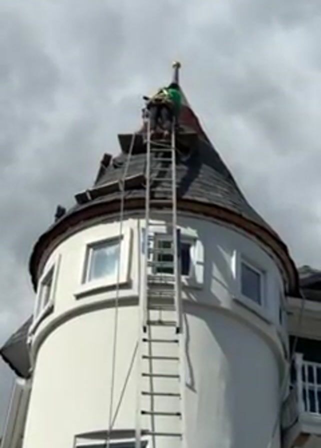 A person wearing a safety harness and a green shirt climbs a tall aluminum ladder to the top of a round, turret-like structure that is part of a building. The turret is white with several windows, and its roof is covered in dark shingles. Some of the shingles appear to be damaged or missing. A gold-colored spire tops the turret. The sky is overcast with dark clouds.