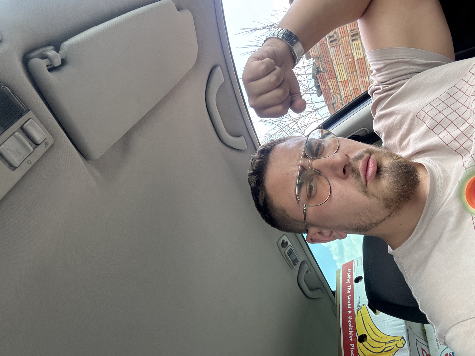 An adult male is seated inside a vehicle, positioned to capture a selfie