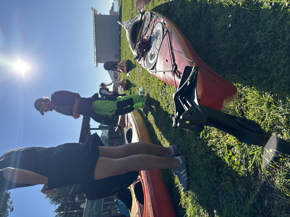 The scene is set in Budva, Montenegro, on a grassy coastal area under a clear, bright blue sky with intense direct sunlight, evidenced by a prominent sun flare and sharp shadows. At least three individuals are present, engaged in preparing for kayaking. In the left foreground, the lower torso and legs of a person are visible, wearing dark shorts or a skirt, a dark t-shirt, and grey and white athletic shoes. They are silhouetted and appear to be adjusting their attire. To their right, a partially visible yellow kayak rests on the grass. In the mid-ground, a male subject stands, facing slightly right, with a beard and wearing a black baseball cap, black t-shirt, black life vest, and bright green waterproof pants with black knee patches. He is looking rightward, and his facial expression suggests a smile or conversation. A clear plastic water bottle is on the grass near his feet. Further into the mid-ground, to the right of the standing male, a third person in dark clothing is partially visible, bent over, attending to equipment near another kayak. Multiple kayaks are positioned on the grass. A prominent red and yellow sea kayak with black deck rigging, a black stern rudder assembly, and a visible paddle blade lies in the right mid-ground. Other kayaks, including a yellow one and additional partially obscured vessels, are scattered across the scene. In the background right, a small, white, rectangular building with a light-colored roof is visible. A wooden or fenced structure with netting is located in the left-mid background. Beyond the immediate grassy area, a body of water and distant land formations are discernible.
