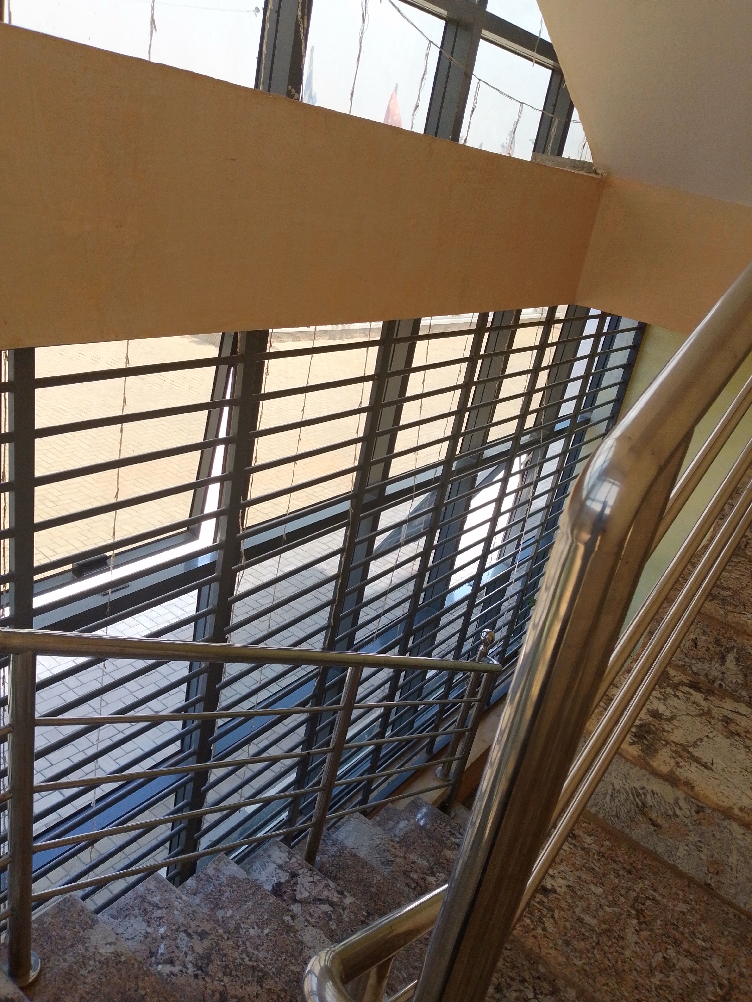 The image displays an interior architectural view from an elevated vantage point within a building in the city of Unknown, Unknown. The primary subject is a multi-level staircase constructed of speckled brown and cream granite or marble, descending from the foreground to the lower-left. A polished metallic railing, consisting of a main handrail and multiple horizontal bars, follows the curve of the stairs on the right side of the frame. Another similar metallic railing section is visible horizontally across the mid-left. A large window wall with dark framing and numerous horizontal security bars dominates the mid-ground, providing a view to an exterior paved area. The exterior paving consists of light brown rectangular pavers laid in a stretcher bond pattern. Above the window, a prominent light beige horizontal beam or bulkhead is visible. The upper interior walls and ceiling areas are painted in light cream tones. Thin, light-colored strings or wires are observed hanging vertically in front of several window panes. No individuals, specific actions, or interactions are present in the scene.