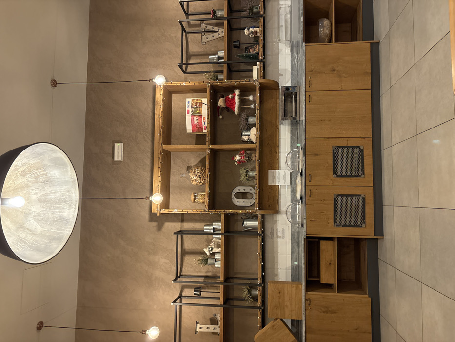 This image depicts an interior view of a commercial establishment, likely a cafe, bakery, or hotel breakfast area, located in Florence, Italy. The scene is presented from a frontal perspective, showcasing a wall with multiple shelving units and a counter below. The walls are finished in a textured, matte brown or taupe color. The ceiling features a large, inverted dome-shaped pendant light centrally positioned, with its interior showing a weathered or reflective silver finish. Two smaller, exposed-bulb pendant lights hang on slender black cords, one to the left and one to the right of the central light, all illuminated. The floor is tiled with large, light-colored square tiles. A long, wooden service counter with a grey, possibly stone or marble, countertop extends across the lower half of the image. The counter base consists of various wooden cabinets, some with dark, perforated metal grille inserts on the doors, and open shelving compartments. A white tiled backsplash with visible grout lines and some surface texture is present above the countertop. Above the backsplash, three distinct shelving units are mounted. The central unit is made of natural wood, comprising multiple open compartments adorned with string lights. It contains decorative jars filled with items like pasta and nuts, along with holiday-themed figurines including Santa Claus and a red-dressed figure, and several small potted plants/herbs. A large, internally lit letter "O" is also displayed on this unit. Flanking the central wooden unit are two black metal frame shelving units. The left unit displays an internally lit letter "L", a small black lamp, potted plants, and various silver-colored containers. The right unit features an internally lit letter "V", potted plants, and a small Christmas tree figurine. On the grey countertop, two clear, domed food covers (cloches) are visible on the left side, suggesting a food service area. A small toaster oven or similar appliance is positioned centrally on the counter. An open wooden shelf on the far right section of the counter base holds a large glass bowl containing light-colored contents. No individuals are present in the scene, and no active interactions are depicted. The overall impression is one of a clean, organized, and decorated space.