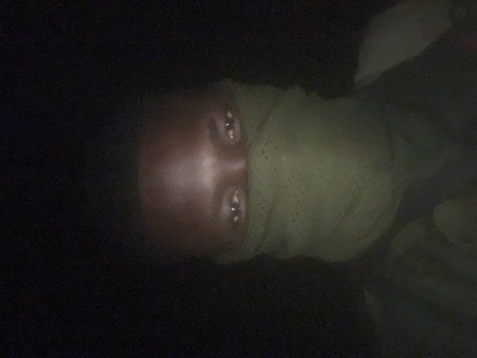 The image presents a close-up portrait of an individual located in Zaki Biyem, Nigeria, under low-light conditions. The subject has dark skin, with only their eyes, forehead, and upper cheeks visible. The eyes are open and directly facing the camera. The lower half of the face is covered by a mottled green fabric, consistent with a neck gaiter or bandana, which exhibits a subtle, irregular texture. A dark garment or strap is partially visible on the subject's right shoulder. The background is uniformly dark and featureless, providing no environmental context beyond the immediate subject.