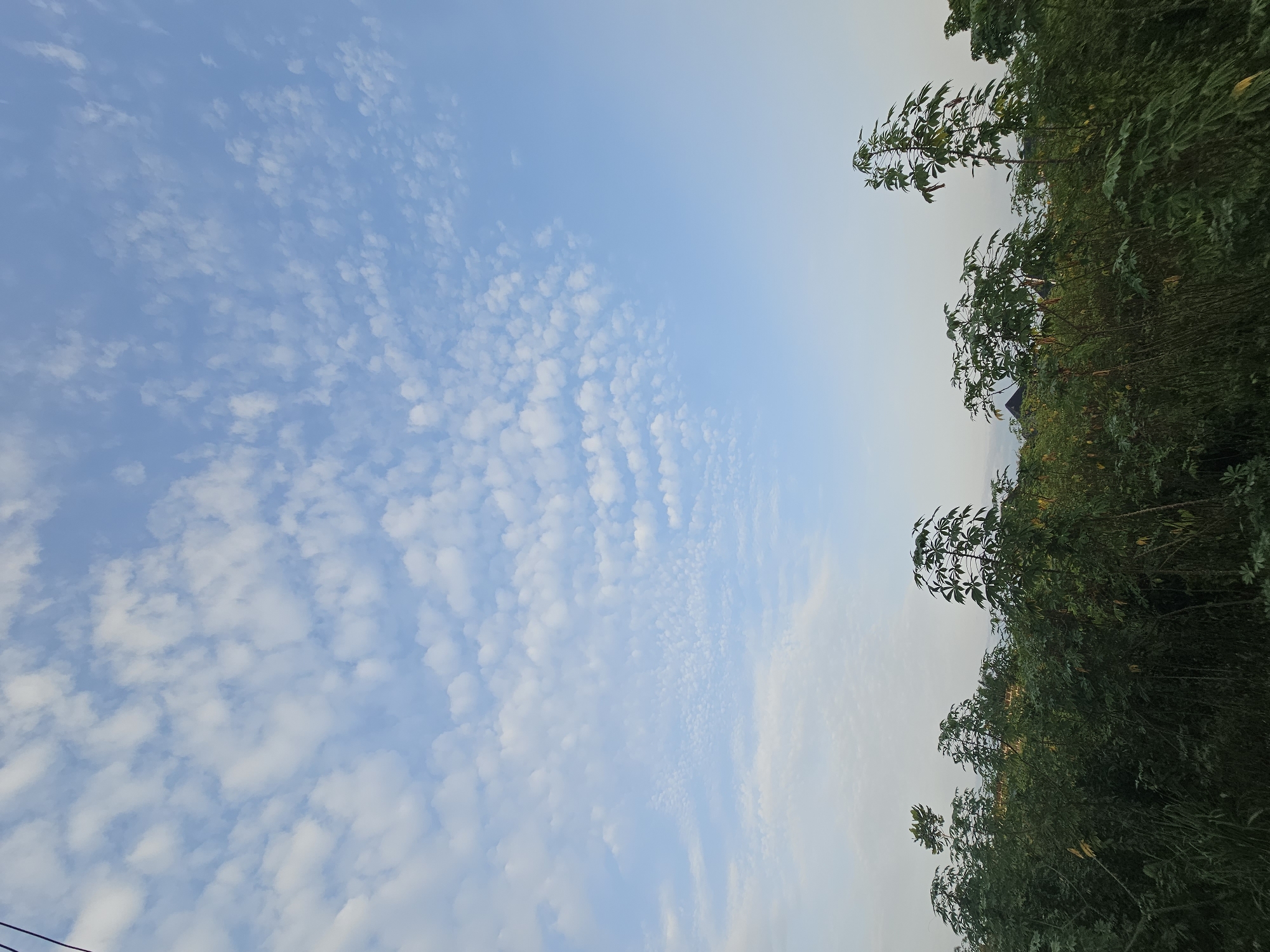 The image captures a sky filled with small, puffy clouds, predominantly in the left half. The right side of the image features dense green foliage, potentially trees and bushes. The location is undetermined.