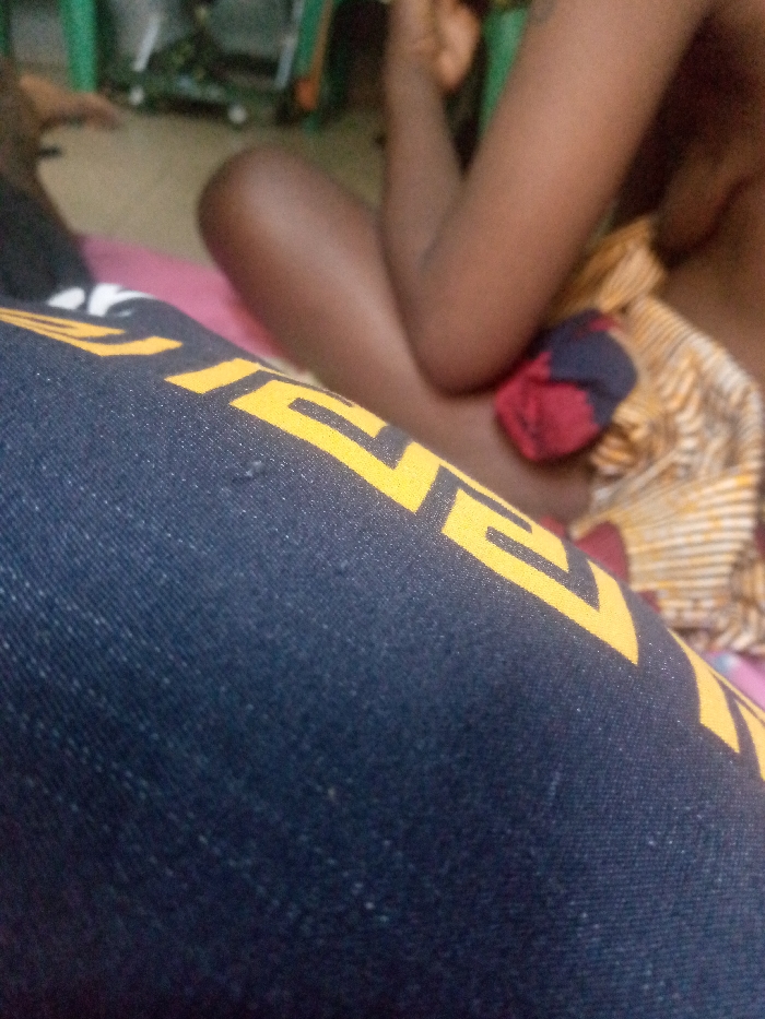 The photograph depicts a person relaxing indoors. A blue fabric with a yellow geometric pattern dominates the foreground. The subject is dark-skinned and wearing a patterned cloth. Their legs are crossed, with the left leg positioned behind the right. A green chair can be seen in the background, along with a glimpse of flooring. The scene has a casual, intimate vibe.