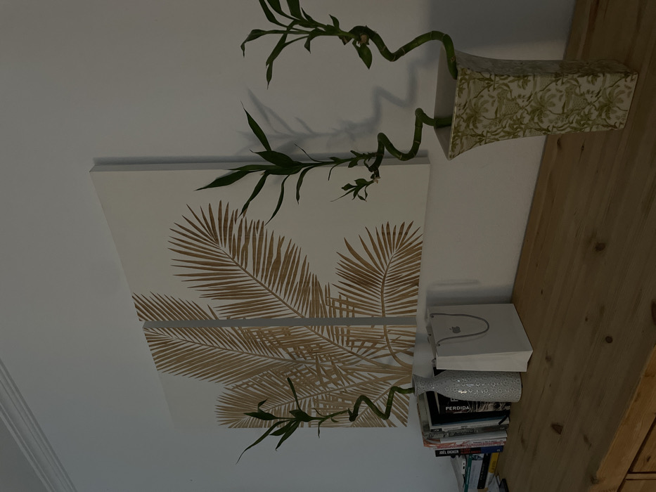 An interior scene in Torrelodones, Spain, depicts a section of a room. A light-colored wooden dresser or console table extends across the lower portion of the frame. Above it, a white wall displays a multi-panel artwork featuring golden palm fronds against a white background, divided by two vertical grey stripes. On the left side of the wooden surface, a stack of books, varying in size and color, rests horizontally. To the right of the books, a white, textured, cylindrical vase contains a single spiral-shaped lucky bamboo stalk with green leaves. Next to the vase is a white shopping bag with an Apple logo. On the right side of the wooden surface, a taller, tapered, rectangular vase with a green and beige foliage pattern holds two distinct spiral-shaped lucky bamboo stalks, each with green leaves. The room is illuminated by dim, ambient lighting, casting soft shadows on the wall and objects. No individuals are present in the image.