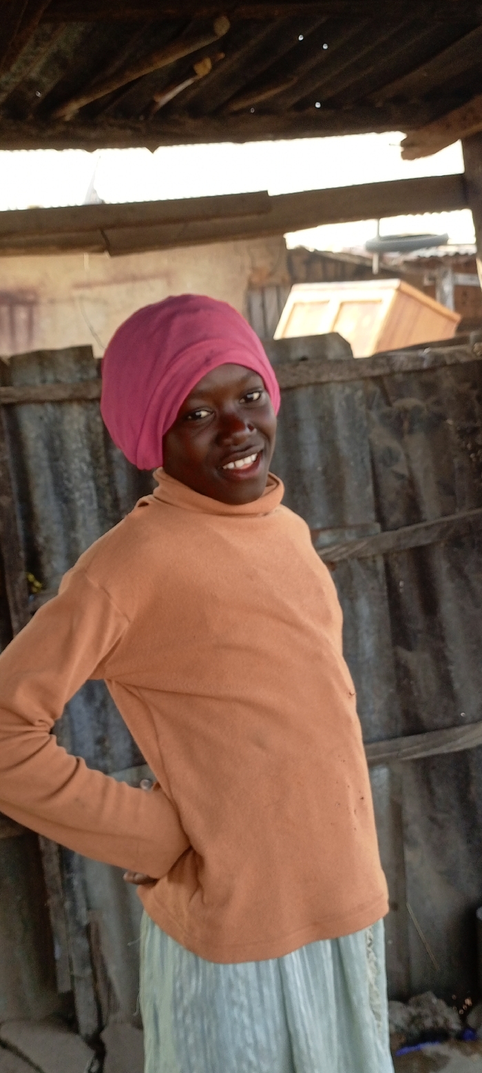 The image captures a young individual, likely female, with dark skin, in a semi-sheltered outdoor setting in Kachia, Nigeria