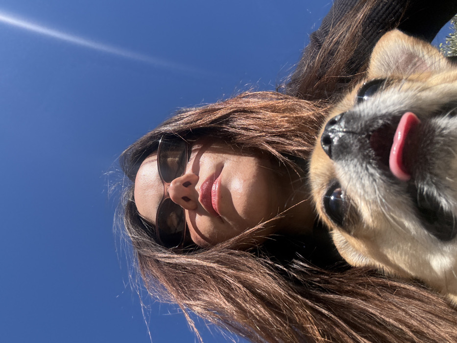 The image presents a low-angle, upward-facing outdoor portrait, taken in Alcoi / Alcoy, Spain. The upper half of an adult female's face and her upper torso occupy the upper portion of the frame. She has long, dark brown hair, and is wearing dark sunglasses with thin frames. Her lips are a reddish-pink color. Strong direct sunlight casts shadows under her nose and chin. She appears to be wearing a dark, possibly black, ribbed garment. In the foreground, positioned below the female and closer to the camera, is the head and upper chest of a small dog, consistent with a Chihuahua or similar breed, with light brown (tan/fawn) fur. The dog's mouth is slightly open, revealing a pink tongue partially extended, and its wide eyes are looking upwards. Both subjects are intensely illuminated by direct sunlight. The background is a clear, bright blue sky, featuring a distinct sun flare in the upper right quadrant, indicating a sunny day. Minimal out-of-focus green foliage is faintly visible at the very bottom right edge of the frame, behind the dog.