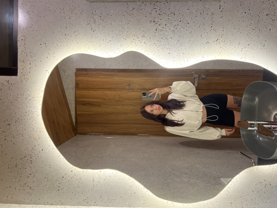 The image depicts a female subject taking a mirror selfie in a modern bathroom or washroom located in Kerobokan Kelod, Indonesia. The subject has long, dark hair and is wearing a light grey, long-sleeved, cropped, zippered hooded sweatshirt and black shorts. Tattoos are visible on her left upper thigh. She holds a light-colored smartphone in her right hand, aiming it towards the mirror to capture her reflection. The mirror itself features an irregular, wavy organic shape and is backlit by a continuous strip of white LED lighting. The walls of the room are a light-colored, speckled material, possibly terrazzo or concrete with aggregate. A vertical wooden door with a silver handle is visible in the background, reflected behind the subject. In the lower left foreground, a dark grey or black basin sink with a chrome and wood-accented single-handle faucet is present. A wooden ceiling or soffit element is visible above the reflected door.