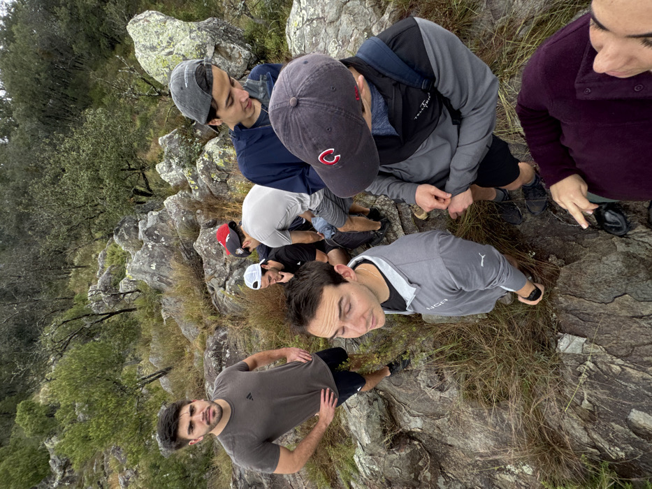The image depicts seven adult males on a rocky, vegetated hillside in Huasca de Ocampo, Mexico