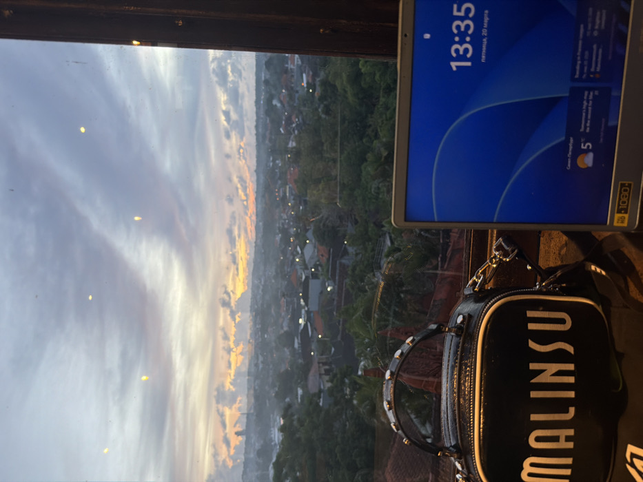 The image presents an elevated view of a cityscape at what appears to be sunset or dusk, originating from an indoor vantage point through a window in Benoa, Indonesia. In the foreground, positioned on the left, is a black handbag with "MALINSU" printed in white capital letters on its front, featuring a studded top handle and a silver chain strap. To the right of the handbag, the visible portion of a laptop screen displays a blue graphical interface. The screen shows a digital clock reading "13:35," the date "пятница, 20 марта" (Friday, March 20), and a weather forecast for "Санкт-Петербург" (Saint Petersburg) indicating 5°C. A "1080" resolution sticker is affixed to the bottom left of the laptop's screen bezel. The midground reveals an expansive urban landscape characterized by a dense arrangement of residential buildings, most exhibiting tiled roofs, interspersed with abundant green foliage and trees. Various artificial lights are visible across the cityscape, suggesting evening conditions. The background features a cloudy sky exhibiting sunset hues, transitioning from vibrant orange and yellow near the horizon to shades of grey and purple in the upper portions. The visible sunset or dusk lighting is inconsistent with the 13:35 time displayed on the laptop screen.
