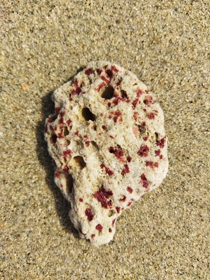 A porous, off-white rock rests on a sandy surface. The rock is irregularly shaped with numerous small holes and red spots scattered across its surface. The surrounding sand is granular and light brown, suggesting a beach environment. The lighting is bright, casting a soft shadow to the left of the rock. The image captures the textures of both the rock and the sand.