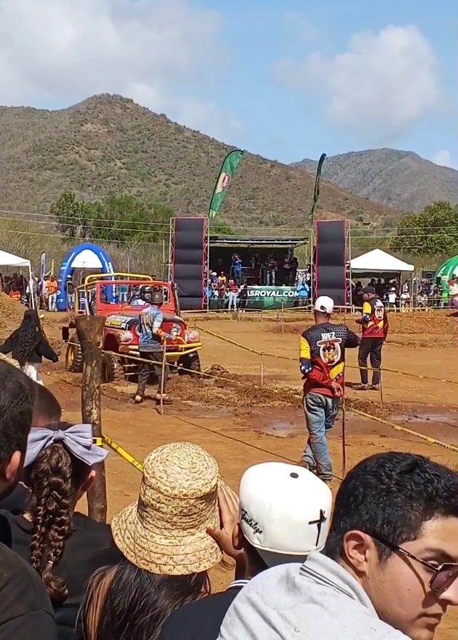 A medium shot shows an outdoor off-road event, apparently a mud-bog race. A red Jeep-like vehicle is struggling in the mud; its crew is assisting. To the rear of the muddy course is a stage with large speakers, and the crowd is fenced off with yellow caution tape. Mountains are visible in the background.