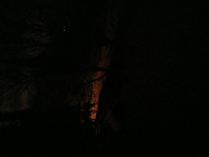 A vertical shaft of light illuminates the center of an otherwise dark image. The light appears to be filtered through foliage, perhaps trees, and reflects on their surfaces. The surrounding area is shrouded in near-total darkness, with only faint hints of branches or other vegetation. The overall impression is one of mystery and the hidden nature of the illuminated object.
