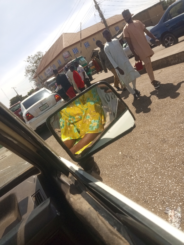The image depicts a street scene in Jos, Nigeria, captured from the interior perspective of a white vehicle, looking out the passenger side window and into the side mirror. The side mirror reflects the lower torso and legs of a person wearing bright yellow shorts or a skirt adorned with green and blue floral patterns. Outside the vehicle, on an asphalt road under clear daylight, multiple individuals are visible. In the foreground, a man in a light brown traditional attire with a matching cap and holding a small red bag walks towards the right. Behind him, another man in a white long-sleeved tunic and dark trousers also proceeds rightwards. Several other pedestrians, dressed in varied casual clothing, including a red shirt, are observed on the pavement and alongside the road. Long, distinct shadows are cast on the textured road surface. Vehicles in the scene include a white sedan (likely a Toyota, based on visible elements) positioned behind the pedestrians, a dark blue sedan parked on the right, and a green and yellow trishaw (Keke Napep) amidst the crowd in the midground. The background features a multi-story building with a brown tiled roof and light-colored walls, featuring multiple windows, some with blue frames. A partially visible commercial sign on the building displays text such as "LESURE..." and "BEAUTY...". Utility poles and power lines are visible against a bright, pale blue sky. Sparse tree foliage is present on the far left.