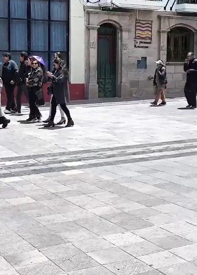 A video shows a group of people walking across a brick-paved plaza. Some of the people are carrying instruments, and a man in a hat appears to be playing a trumpet. There is a mix of old and young people, most dressed in dark clothing. Buildings are visible in the background, including a restaurant named "Ta picana Restaurant" and a building with the sign "CETPRO DE ARTE." People are walking in different directions, and there are no clear interactions besides walking near each other. The weather is sunny.